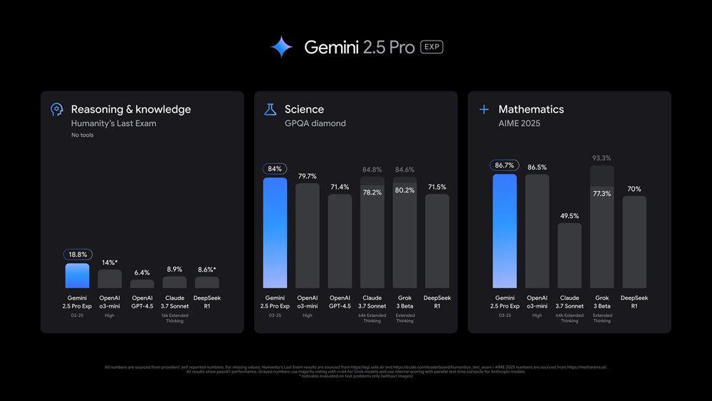 제미나이 2.5 Pro(실험적 버전)가 지식/추론(Humanity’s Last Exam), 과학(GPQA), 수학(AIME 2025) 등 벤치마크에서 경쟁 AI 모델 대비 뛰어난 성적을 기록했다. 예를 들어 인간 수준 지식과 추론을 측정하는 테스트에서 제미나이는 18.8%로 OpenAI와 Anthropic 모델을 근소하게 앞섰다 .
